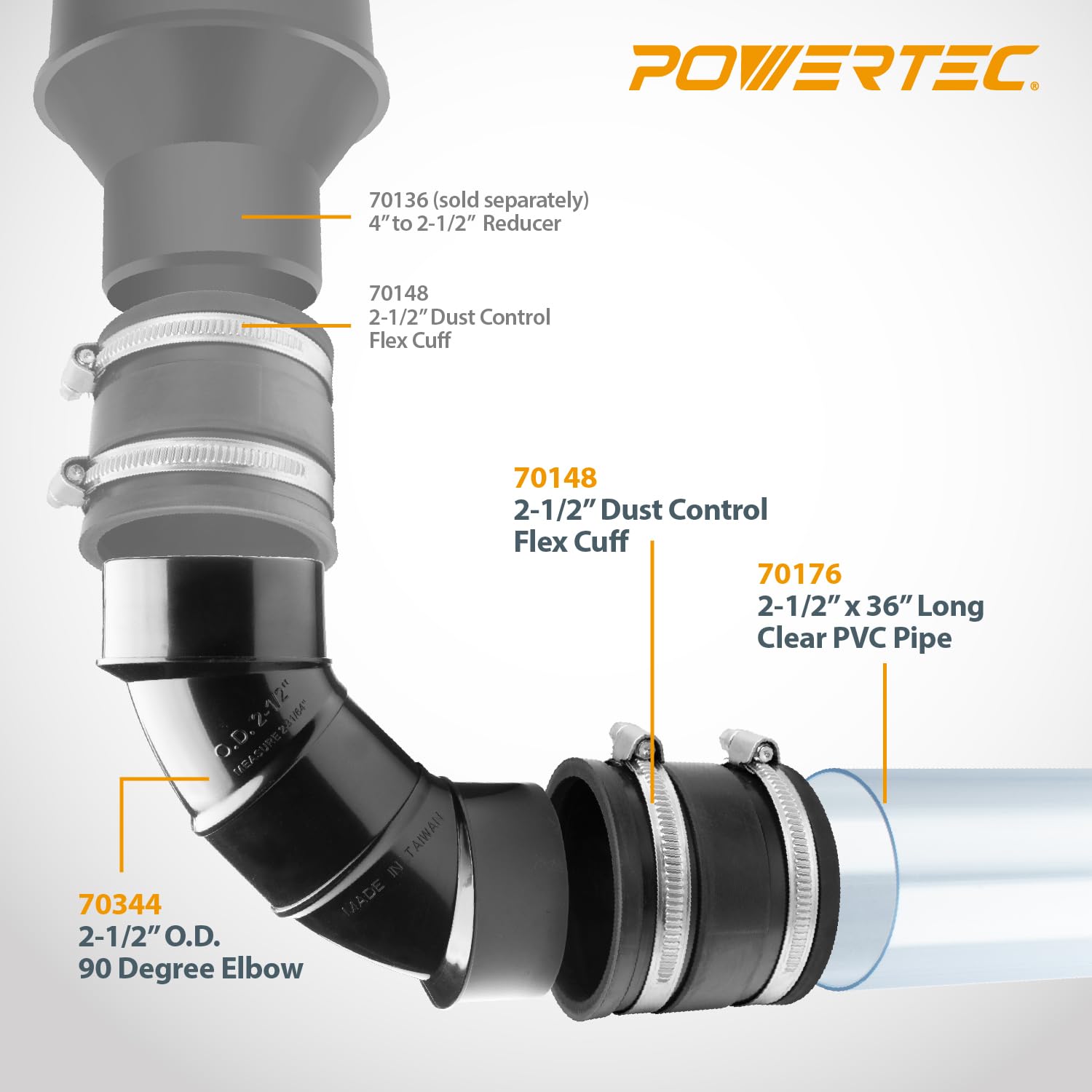 POWERTEC 70445 Clear PVC Pipe 2-1/2" x 36" Long, with 2-1/2" OD 90 Degree Elbow and 2-1/2 Inch Dust Control Flex Cuff, Rigid Plastic Tubing and Connector for Dust Collection System