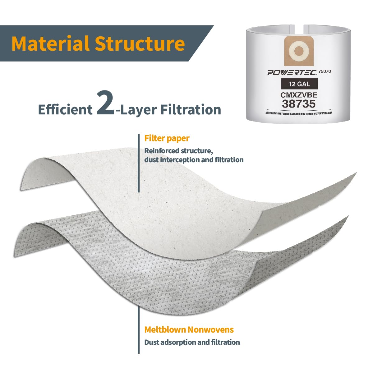 - 【VACUUM BAGS COMPATIBILITY】: Replacement filter bags CMXZVBE38735 (38735 / 9-38735) for Craftsman 12 Gallon models: CMXEVBE17606, CMXEVBE17594