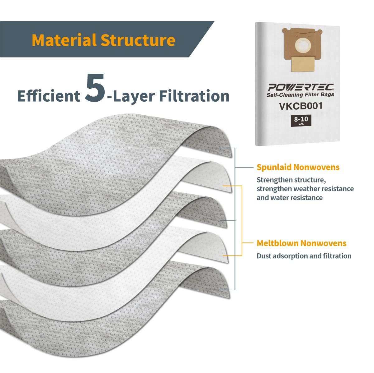 POWERTEC VKCB001 Dust Bags for Vacmaster 9PK, for VK811PH, VK1011SIWTH 8-10 Gallon Wet/Dry Vacuums, Replacement for Vacmaster High Efficiency Dust Collection Bags, Vacuum Bags, Filter Bags (75043-P3)—